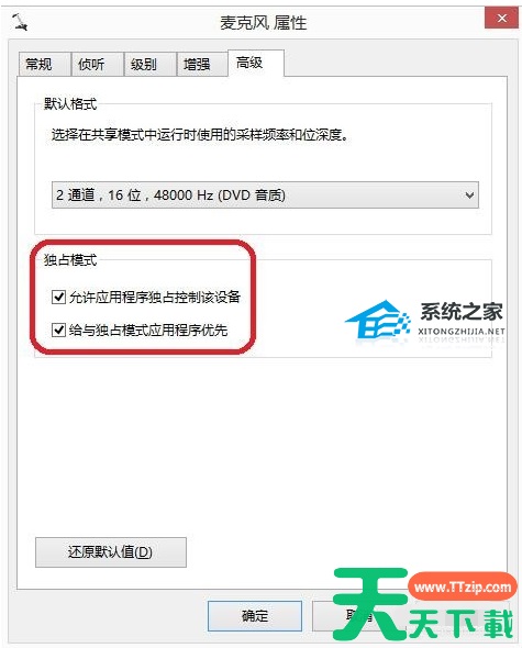 10、分别为“允许应用程序独占控制该设备”“给与独占模式应用程序优先”。