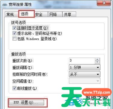 4、在打开的宽带连接属性界面中,切换到“选项”标签页,然后在“选项”中找到并双击打开PPP设置按钮。