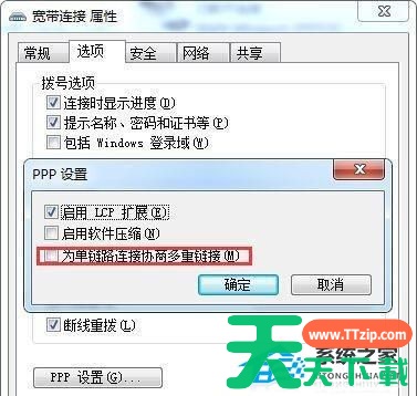5、此时即会弹出一个PPP设置窗口,将“为单链路连接协商多重链接”的勾选去掉,再点击确定按钮保存即可。
