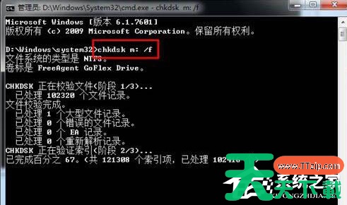 4、输入命令“chkdsk m:/f”(其中m代表磁盘的对应字母),尝试修复磁盘错误。