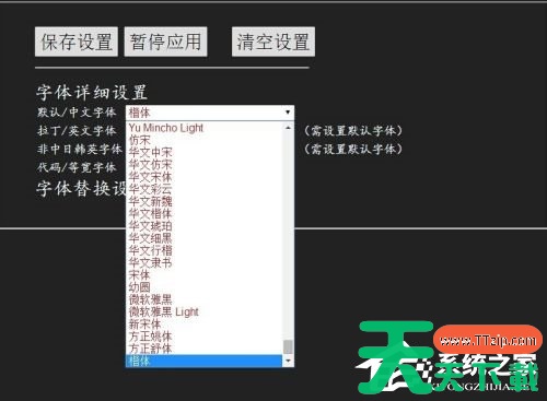 5、根据你自己的需求来设置网页的强制字体显示,最好把中文和拉丁文/英文这种常见语种设置为同一字体类型,这样就不会出现一大一小的不协调情况。