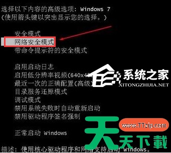 2、开机的时候按F8键,这时键盘肯定能用,然后到高级启动选项下选择“带网络的安全模式”。