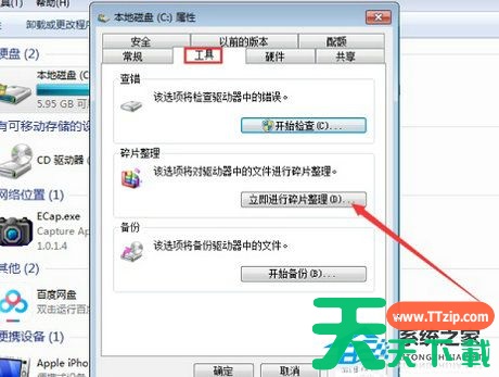 2、在新窗口弹出后,依次点击“工具”、“立即进行碎片整理”。
