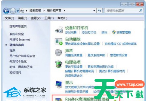 1、如果声音图标依然打红叉,则依次点击开始按钮_控制面板_硬件和声音_Realtek高清晰音频管理器。