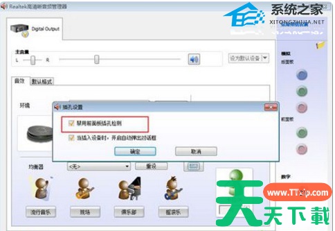 3、勾选“禁用前面板插孔检测”,点击确定,这时候后右下角的小喇叭红叉就消失了,电脑就有声音了。