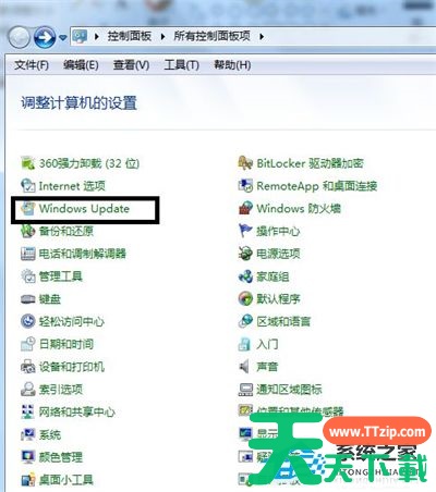 2. 打开控制面板窗口中单击”Windows Update“选项。