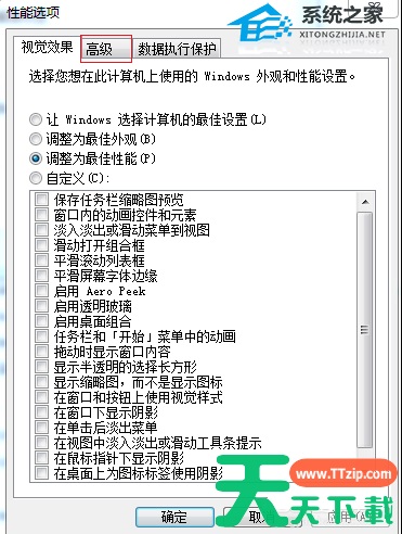 4. 在“性能选项”界面中切换到“高级”选项,进入下一步。