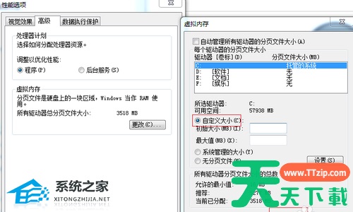 5. 点击“虚拟内存”功能下的更改按钮打开。在“虚拟内存”页面,把“自动管理所有驱动器文件大小”前面的勾去除,然后勾选下面“自定义大小”,接着手动设置内存大小,在原来的基础上扩大一些,点击“确定”即可。