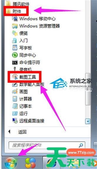 打开任务栏之中的开始菜单,接着在【所有程序】里面找到【附件】,其中就有【截图工具】,点击选择它即可使用。