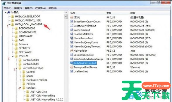2. 依次打开HKEY_LOCAL_MACHINE—System—CurrentControlSet—Services—NetBT—Parameters。