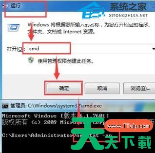 4. 再次打开“运行”,输入“cmd”,回车确定,在图示位置输入“netstat -an”,按下回车,就可以打开445端口了。