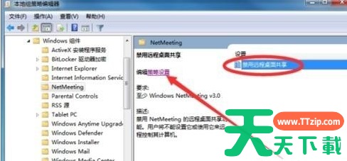 6、进入“NetMeeting”选中其右侧窗格中的“禁用远程桌面共享”,再点击“策略设置”选项命令。