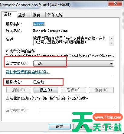 2、找到并将“Network Connections”设置为“手动”并启动,如图所示: