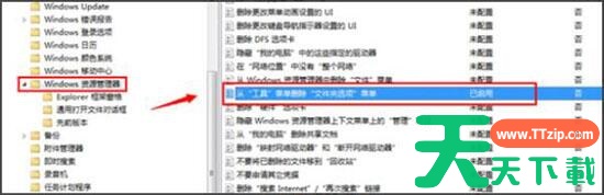 3、然后在“Windows资源管理器”的列表下找到“从工具菜单删除文件夹选项”项目,如下图,目前显示是启用的状态;如图所示: