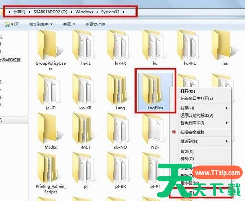1.首先打开“计算机”,并依次找到“C:WindowsSystem32LogFiles”文件夹,鼠标右键LogFiles文件夹,并选择“属性”,如下图所示: