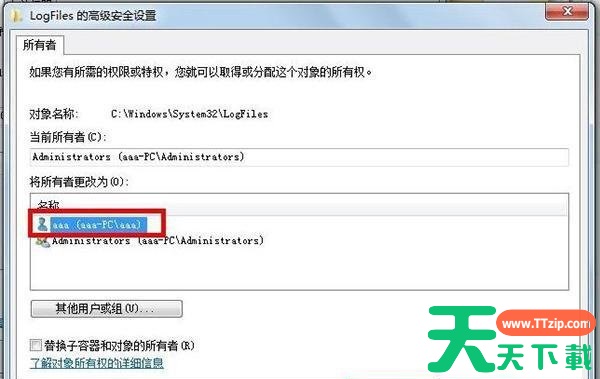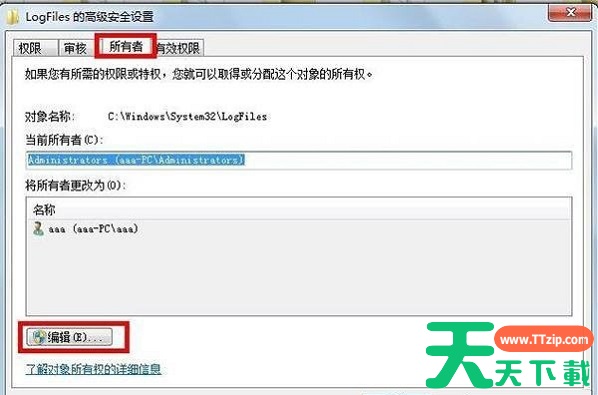 3.在LogFiles的高级安全设置界面中,再切换至“所有者”选项卡,点击“编辑”按钮,如下图所示;