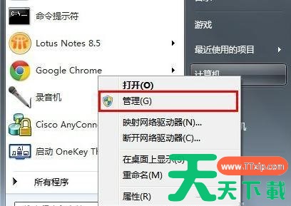 6.在点击“开始菜单”,鼠标右键点击“计算机”,并选择“管理”,如下图所示;