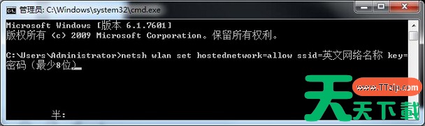 4. netsh wlan set hostednetwork mode=allow ssid=英文网络名称key=密码(最少8位);