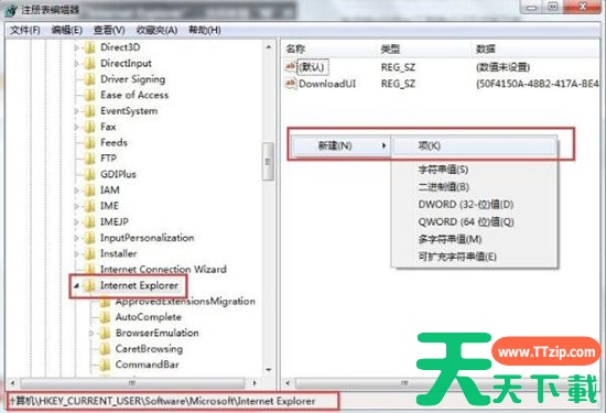 3、依次打开HKEY_CURRENT_USER\Software\Microsoft\Internet Explorer空白地方右击“Internet Explorer”选择新建“项”将其项重命名为“Styles”。如图所示: