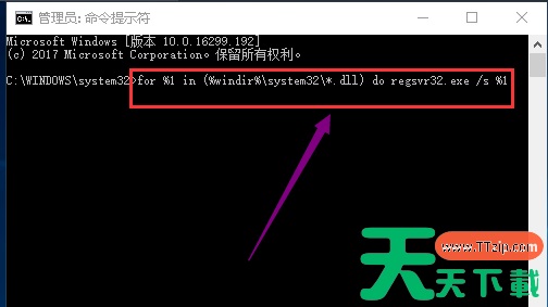 2.在打开的命令符号符界面中输入for %1 in (%windir%\system32\*.dll) do XXX32.exe /s %1,然后按键盘上的回车键,进入下一步。
