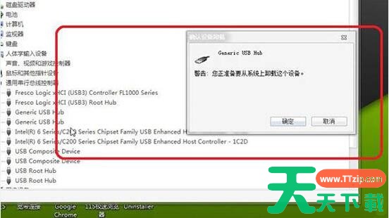 3、可是我怎么能记住那名字呢?还是用我的土办法,挨个实验,逐个卸载,哪一个卸载之后,鼠标底板的红灯灭了,那个就是对应的usb接口了。如图所示:
