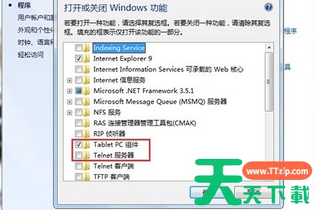 1、依次点击“开始”→“控制面板”→“程序”,“在程序和功能”找到并点击“打开或关闭Windows功能”进入Windows系统功能设置对话框。找到并勾选“Telnet客户端”和“Telnet服务器”,最后“确定”按钮,稍等片刻即可完成安装;如图所示: