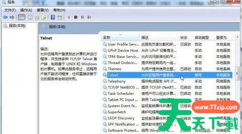 3、在Windows7旗舰版的服务项列表中找到telnet,可以看到它的状态是被禁用的;如图所示: