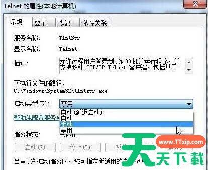 4、下载双击Telnet项或者从右键菜单选择“属性”,将“禁用”改为“手动”;如图所示: