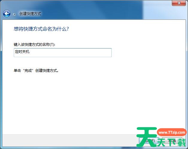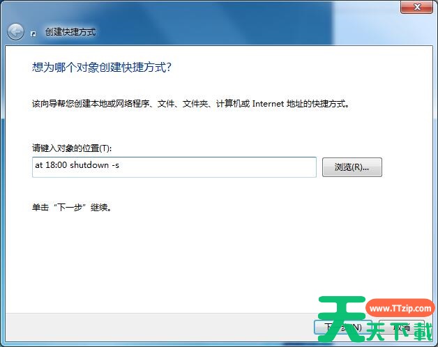 2、点击【快捷方式】后:输入【at 18:00 shutdown -s】在对像位置。 注:里面的18:00就是18点关闭电脑。以后也是到这个时间也会自动关机的。