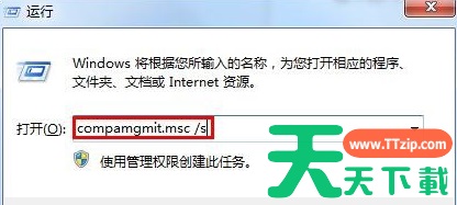 1.首先win+R键打开“运行”窗口,在其中输入compamgmit.msc /s后回车。