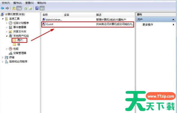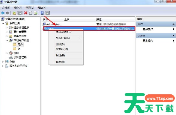 3.可以看到右边弹出两个账户,选中【Guest】账户,鼠标右击。