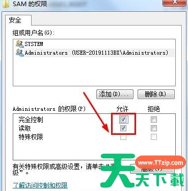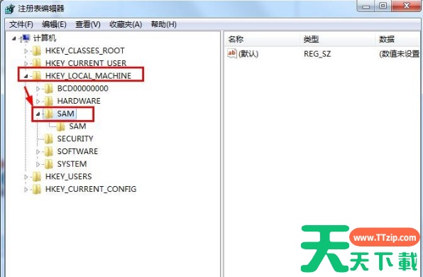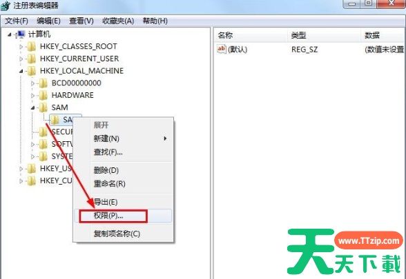 7.弹出“注册表编辑器窗口”,定位到HKEY_LOCAL_MACHINESAMSAM,鼠标右键点击,选中【权限】。