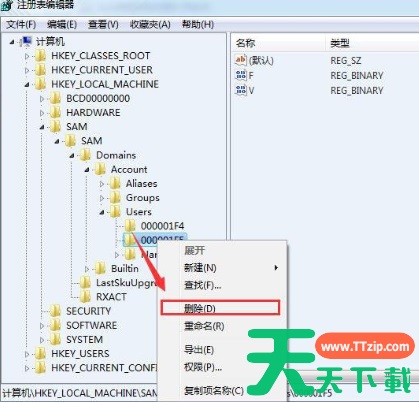 9.接着按F5刷新一下,在SAM下面找到Domains/Account/Users/000001F5,删除它即可。