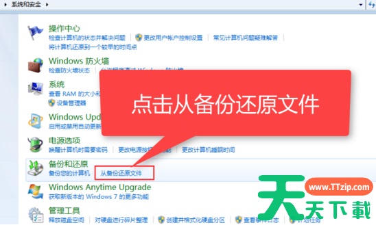 2、点击打开系统和安全,在系统和安全窗口中找到备份和还原,点击下面的从备份还原文件。