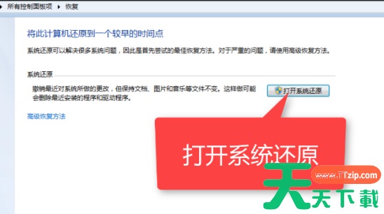 3、在新窗口中点击打开系统还原按钮。