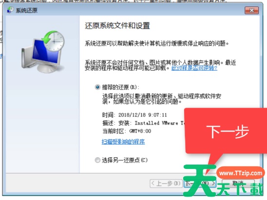 4、选择推荐的还原的选项,然后继续下一步。