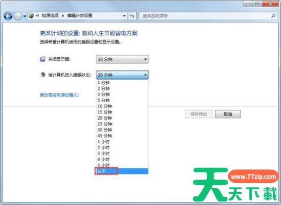 5、在新窗口中的使计算机进入睡眠状态的下拉中选择从不,点击保存修改即可。