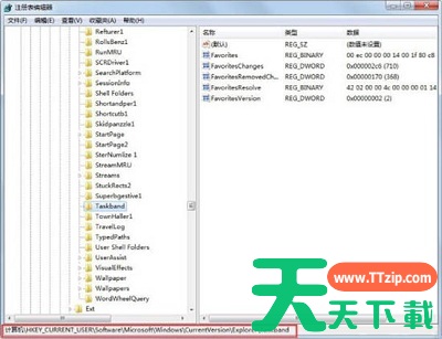 3、依次打开HKEY→CURRENT→USER→Software→Microsoft→Windows→CurrentVersion→Explorer→Taskband。