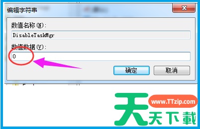 6、双击打开刚刚创建的【DisableTaskMgr】,在【数值】一项,设置成【0】,然后点击【确定】,即可解决问题。