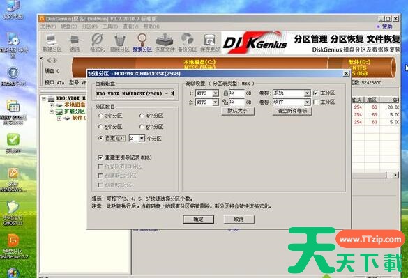 5.弹出这个窗口,设置分区数目和大小,系统盘一般建议50G以上,点击确定执行分区操作;