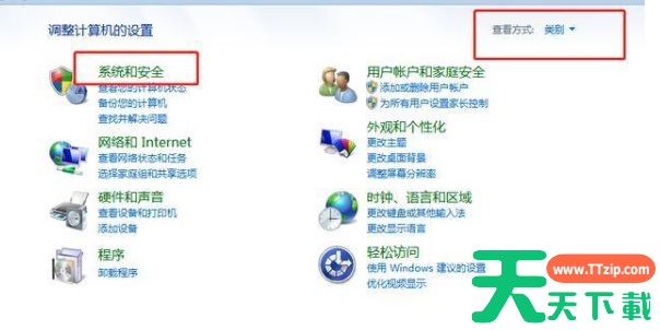 1、点击开始菜单,选择打开“控制面板”,在控制面板中,将“查看方式”修改为“类别”,点击“系统和安全