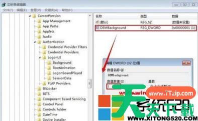 2、在开始菜单运行处,输入"regedit",打开注册表,找到键值HKEY_LOCAL_MACHINESOFTWAREMicrosoftWindowsCurrentVersionAuthenticationLogonUIBackgroundg,打开键值,如果值为0则表示不使用OEM背景仅使用Windows默认背景;若为1则表示使用OEM背景,在这里使用1 ;