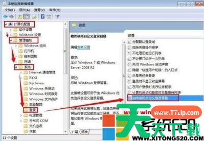 3、在开始菜单运行处,输入"gpedit.msc",打开本地组策略编辑器,"计算机配置"→"管理模块"→"系统"→"登录”中找到“始终使用自定义登录背景”;