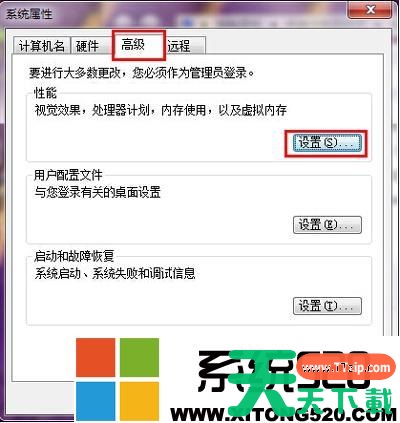 3.在系统属性窗口中,切换到“高级”项,点击选择“设置(S)”进入下一步操作;