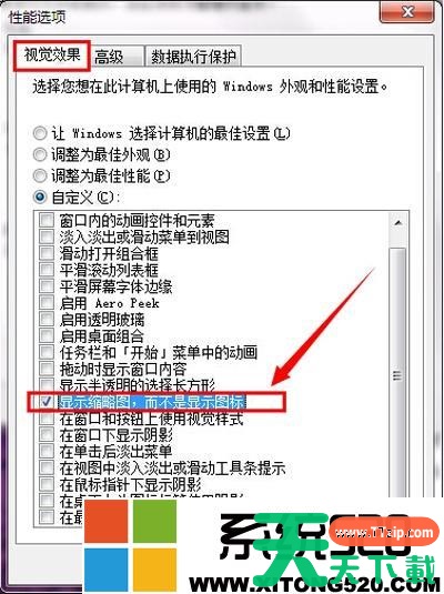 4.在弹出的性能选项窗口中,点击“自定义(C)”勾选其下的“显示缩略图。而不是显示图标”点击“确定”完成设置。