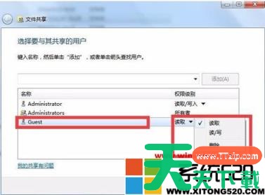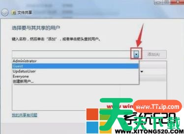 6、再如下图所示那样选择Guest(或者Everyone)用户,然后点击添加。