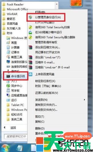 1、点击左下角“开始”按钮打开菜单,进入“所有程序--附件”,右键点击“命令提示符”打开菜单,选择“以管理员身份运行”;
