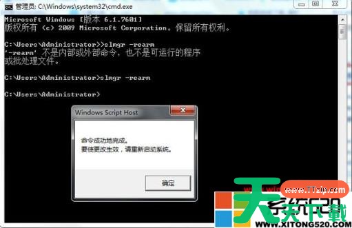 2、首先我们要取消KMS激活方式,在弹出命令提示符,输入“slmgr -rearm”命令,按下回车等待命令执行完成,之后会弹出对话框,点“确定”,之后重新启动计算机;