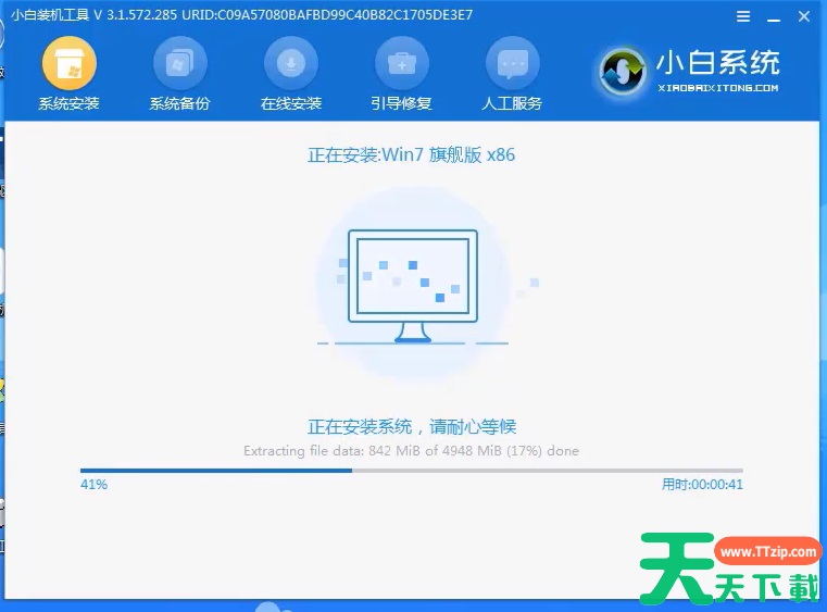 8、进入PE后无需操作,小白工具自动安装win7系统。