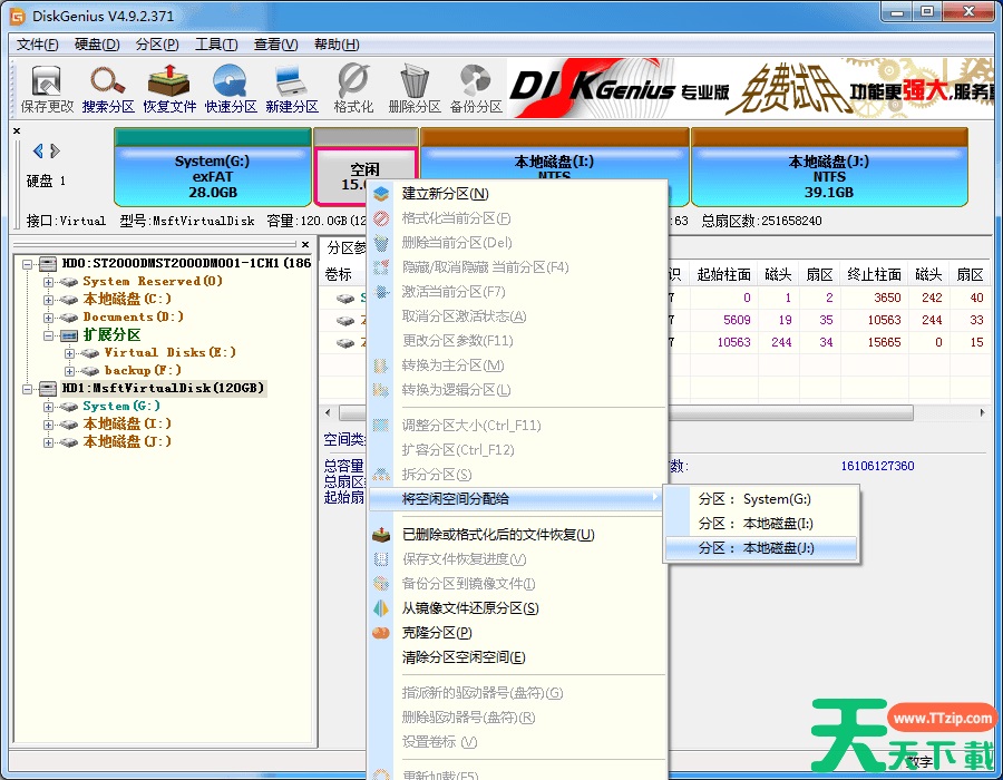 1、用鼠标右键点击空闲区域,并选择“将空闲空间分配给”选项,然后就可以选择想要合并的分区。